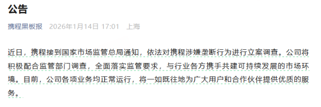 对此,携程方面回应称,公司将积极配合监管部门调查,全面落实监管要求,与行业各方携手共建可持续发展的市场环境。携程同时强调,目前公司各项业务均正常运行,将一如既往地为广大用户和合作伙伴提供优质的服务。