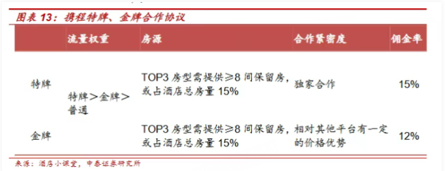 从抽成比例来看,携程对商家的抽佣比例跟所在细分行业和商家的议价能力有关。根据中泰证券研报,携程住宿预订业务综合佣金率在8%-10%左右;对于流量倾斜的特牌、金牌等佣金率更是高达12~15%。