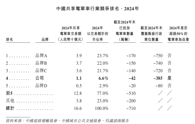 据灼识咨询报告,按2024年的交易额及截至该年末已投放的车辆数量计算,松果出行是中国外围发展区域中最大的共享电单车服务运营商。该报告中的外围发展区域,是指县级市、县、自治县、旗等所有非市辖区的县级行政单位。
