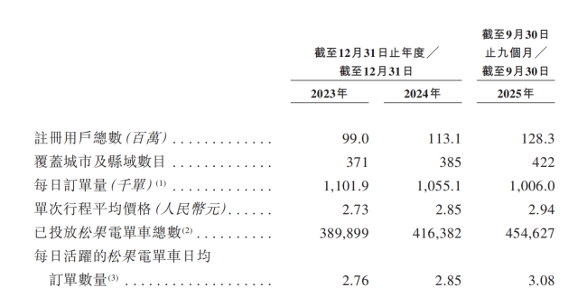 2023年-2025年9月,松果出行覆盖城市及县域数量,从371个增加到422个;投放电单车数量,从约39万辆增至45.46万辆;单次行程平均价格从2.73元增至2.94元;每日活跃车辆日均订单量也从2.76次增至3.08次。